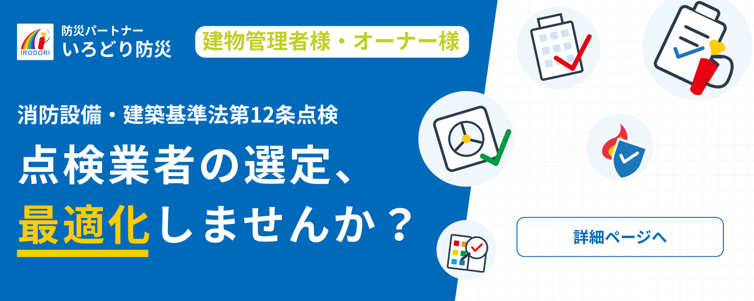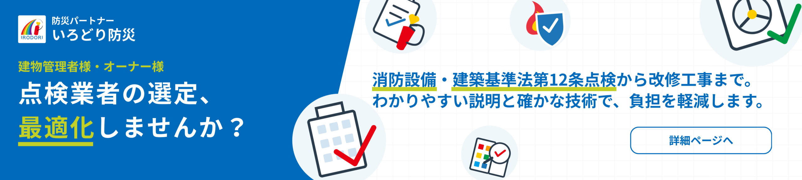 いろどり防災は大阪府寝屋川市を拠点に、消防設備点検をはじめとする各種法定点検・工事を通じて建物の「安全」と「安心」を支える防災の専門会社です。防火対象物点検の他、連結送水管耐圧試験や自家発電設備負荷試験、各種改修工事まで幅広く対応可能。法令順守はもちろん、わかりやすい説明と丁寧な対応を大切にし、建物所有者様や管理者様の負担を軽減します。地域密着の防災パートナーとして確かな技術で頼に応えます。